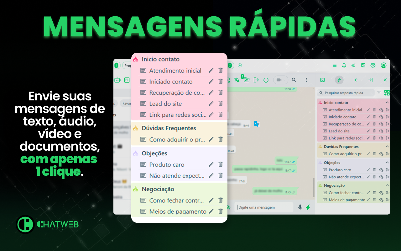 Padronize suas conversas e economize tempo com scripts prontos e personalizáveis. Os Scripts de Mensagem do Chatweb CRM ajudam você a responder rapidamente, manter um atendimento consistente e aumentar a taxa de conversão em cada interação.