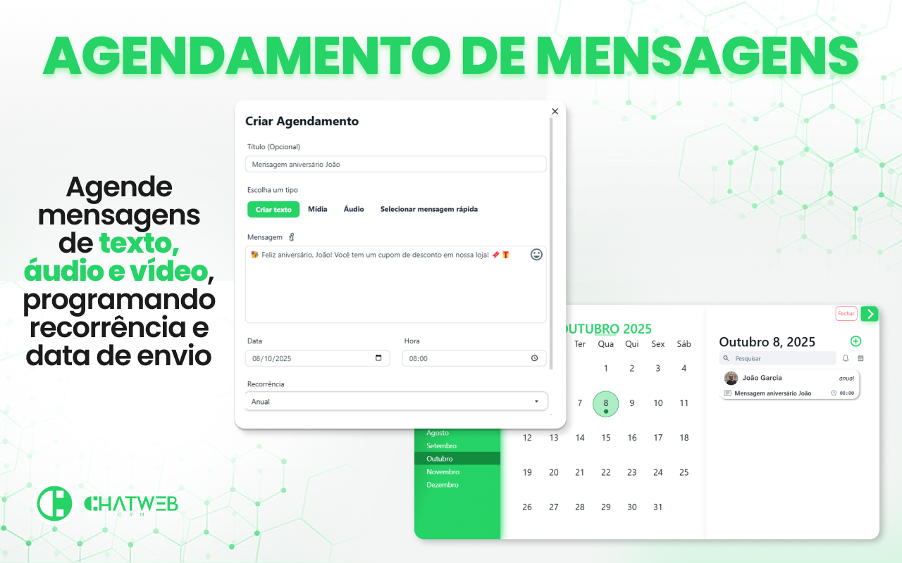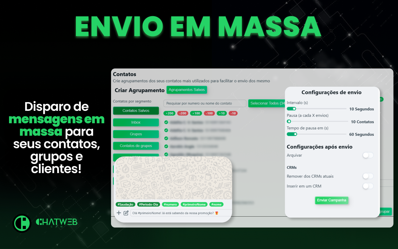Envie mensagens personalizadas para vários contatos de uma só vez, sem perder a naturalidade da conversa. Com o disparo em massa do Chatweb CRM, você economiza tempo, amplia seu alcance e mantém um relacionamento próximo e estratégico com seus clientes.